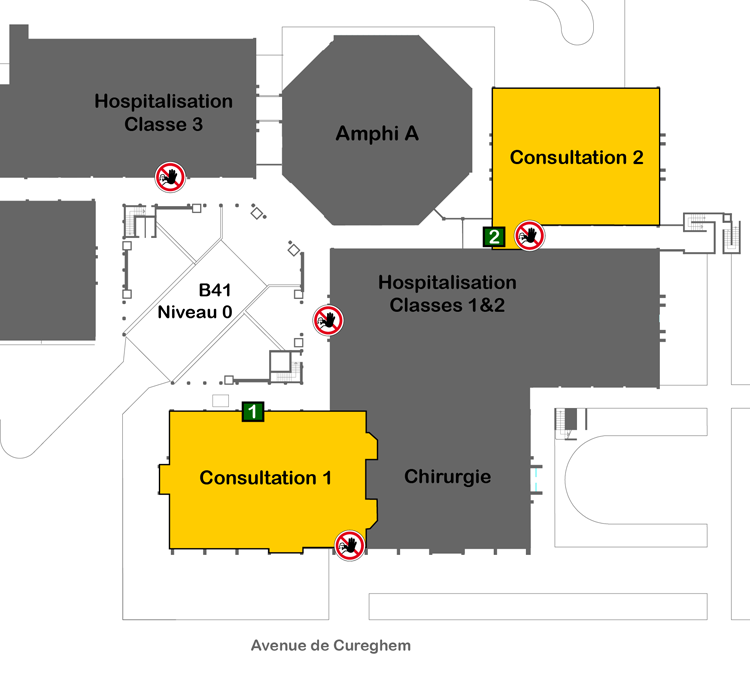 Consultation rooms are accessed exclusively through doors 1 and 2( et ) in the clinic, to avoid/limit contacts with hospitalised horses.